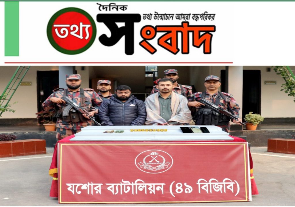 ৪ ডিসেম্বর বৃহস্পতিবার বিকাল ৫টায় যশোর ব্যাটালিয়ন (৪৯ বিজিবি) এর একটি টহলদল গোপন সংবাদের ভিত্তিতে যশোরের কোতোয়ালী থানাধীন মুরাদগড় বাস স্ট্যান্ড পাকা রাস্তার উপর হতে ০২ জন আসামীসহ ১.১৬৪ কেজি ওজনের ১০ (দশ) টি স্বর্ণের বার এবং ০৩টি মোবাইল আটক করে। আটককৃত ব্যক্তিদের প্যান্টের পকেটে বিশেষ কায়দার লুকায়িত অবস্থায় উক্ত স্বর্ণের বারগুলো পাওয়া যায়। আটককৃত আসামীদের প্রাথমিকভাবে জিজ্ঞাসাবাদে জানা যায়, তারা ঢাকা থেকে যশোর ও চৌগাছা হয়ে ভারতে পাচার করার উদ্দেশ্যে স্বর্ণের বারগুলো নিয়ে যাচ্ছিল। তারা আরো জানায় ঢাকার তাতিবাজার এলাকার চোরাকারবারীদের নিকট হতে স্বর্ণের বারগুলো সংগ্রহ করে চৌগাছায় গমন করছিল। আটককৃত ব্যক্তিদের নাম ও ঠিকানা- (১) মোঃ ফরিদুল ইসলাম (২৮), পিতাঃ মোঃ আবুল কালাম, গ্রামঃ দক্ষিণ চাঁদপুর, ডাকঘরঃ দর্শনা, থানাঃ দামুড়হুদা, জেলাঃ চুয়াডাঙ্গা, (২) মোঃ মাহাফুজ আলম (৩১), পিতাঃ আব্দুল লতিফ, গ্রামঃ বাজিপোতা, ডাকঘরঃ পান্তাপাড়া, থানাঃ মহেশপুর, জেলাঃ ঝিনাইদহ। আটককৃত স্বর্ণের মূল্য ২,১০,৬৬,০৭২/- টাকা ও ০৩টি মোবাইল এর মূল্য ৪১,৫০০/- টাকা, ০১টি ইয়ার বাট এর মুল্য ১৫০০/-, ০১টি পাওয়ার ব্যাংক ২,০০০/- এবং নগদ ৮,১৭২/- টাকাসহ সর্বমোট সিজার মূল্য ২,১১,১৯,২৪৪/- (দুই কোটি এগার লক্ষ উনিশ হাজার দুইশত চুয়াল্লিশ) টাকা। আটককৃত আসামীর বিরুদ্ধে মামলা দায়ের এর মাধ্যমে আসামীকে যশোর কোতয়ালী মডেল থানায় হস্তান্তর করা হয়েছে। এ ব্যাপারে যশোর ব্যাটালিয়নের অধিনায়ক লেঃ কর্নেল সাইফুল্লাহ্ সিদ্দিকী, এসপিপি, পিএসসি জানান, কিছু দিন যাবত বাংলাদেশ হতে ভারতে স্বর্ণ পাচারের প্রবণতা বৃদ্ধি পেয়েছে। উক্ত স্বর্ণসহ পাচারকারী আটকের নিমিত্তে বিজিবি‘র আভিযানিক কার্যক্রম ও চেষ্টা অব্যাহত রয়েছে। এরই ধারাবাহিকতায় যশোর ব্যাটালিয়নের দায়িত্বপূর্ণ এলাকায় অভিযান পরিচালনা করে স্বর্ণসহ পাচারকারী আটক করতে সক্ষম হচ্ছে। সীমান্তে বিজিবির এ ধরনের আভিযানিক কার্যক্রম সব সময়ই অব্যাহত থাকবে।